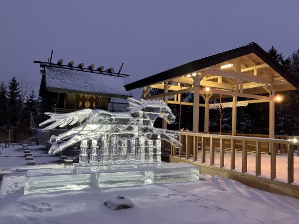 また、恒例の青森県氷彫刻会の方々ご奉納による「氷の彫刻」が、美しくご参拝のみなさんをお迎へいたします。