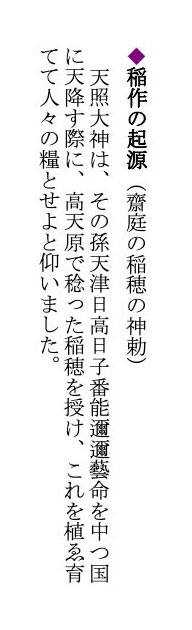 ◆その後、天照大神が保食神の所に天熊人を遣はすと、息絶えた保食神の頭から牛馬、額から粟、眉から蚕、目から稗、腹から稲、陰部から麦・大豆・小豆が生まれてゐました。