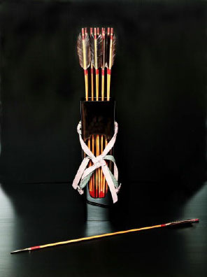 矢は「矢竹」を乾燥させ形を整へたものに拭漆の技法で仕上げてゐるが、両正宮の同御料に見られる銀蒔絵による「朽木形」の文様はない。