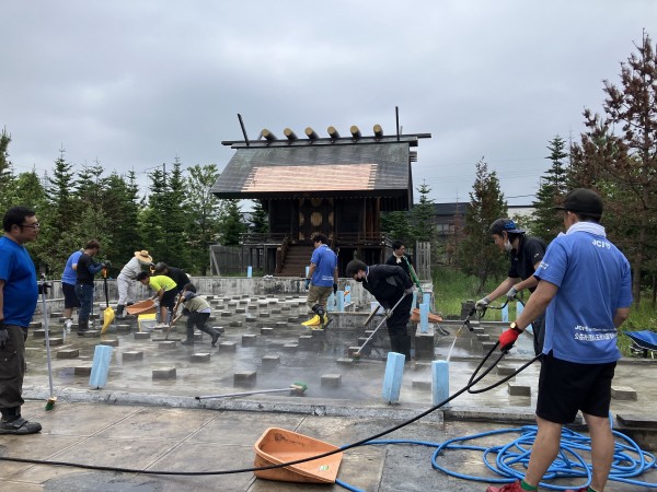 お蔭さまで綺麗になった本殿前で宵宮祭がご奉仕叶ひ、燃え残った木材を洗浄して再利用に備へることができました。