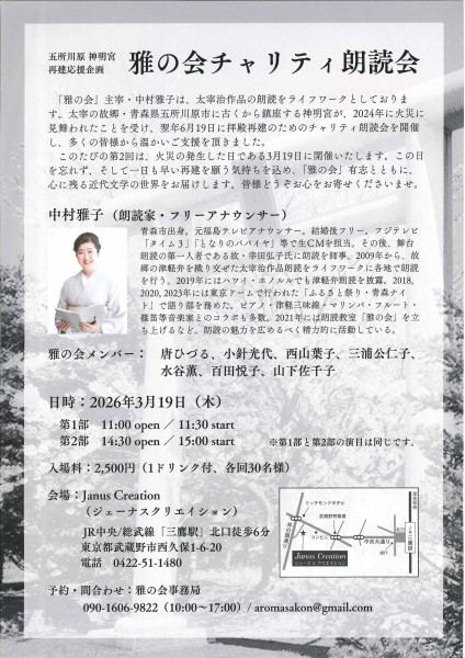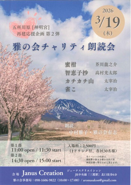 朗読家、中村雅子氏主宰の「雅の会」開催について