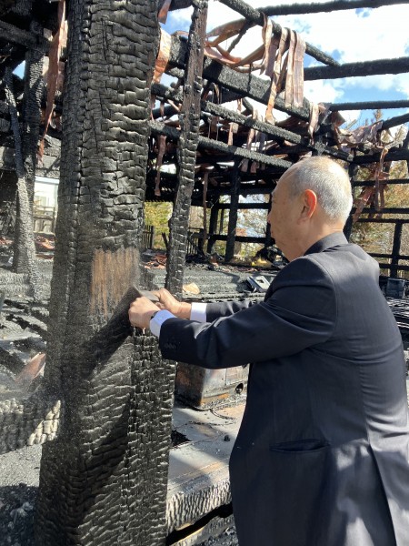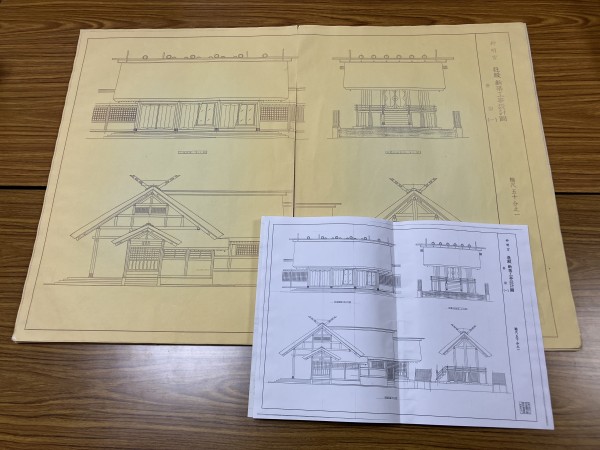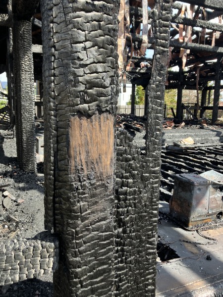 25年前に御社殿を設計していただいた日本建築工藝設計事務所の松島社長さんが、再建のスタートとして当時の設計図の縮刷版を携へてお見舞ひにおいでになりました。そして、焼け残った柱に近づき足元の銅板を拾ひ上げて炭化した部分を削り取ると、柱の芯がしっかりと残ってをりました。「見てください。木は燃え尽きてはゐません。さぁ、この命を蘇らせて立派に再建いたしませう。」との激励。辛いことや悲しみに包まれやうとも芯となる魂をしっかり持たねばと覚悟新たにいたしました。